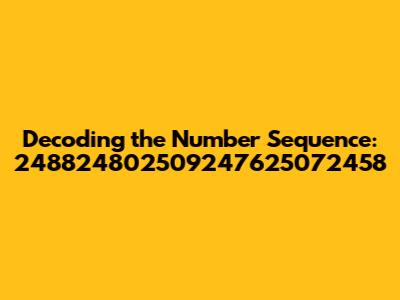 Now, let's brainstorm some potential meanings for this number sequence. The number sequence 248824802509247625072458 could be a serial number. Serial numbers are commonly used to identify specific items, products, or documents. They're often unique and assigned by manufacturers or organizations. If this is a serial number, it could be linked to a particular product or system. Another possibility is that it represents a date and time. Given its length, it might encode a very specific moment, down to the second or even millisecond. Perhaps it’s a timestamp of some kind. Then there's the chance that it's part of a coded message. Number sequences are frequently used in cryptography to encrypt or hide information. In this case, the sequence might need to be decoded using a specific algorithm or key. It could also be an identification number, similar to an account number or employee ID. These numbers are typically used to identify individuals or entities within a system. Finally, don't rule out the possibility that it’s simply a random number with no inherent meaning. Sometimes, numbers are generated randomly for various purposes, such as in simulations or games. While this might be the least exciting option, it's essential to consider it. By exploring all these possibilities, we can approach the sequence 248824802509247625072458 with a broader perspective.